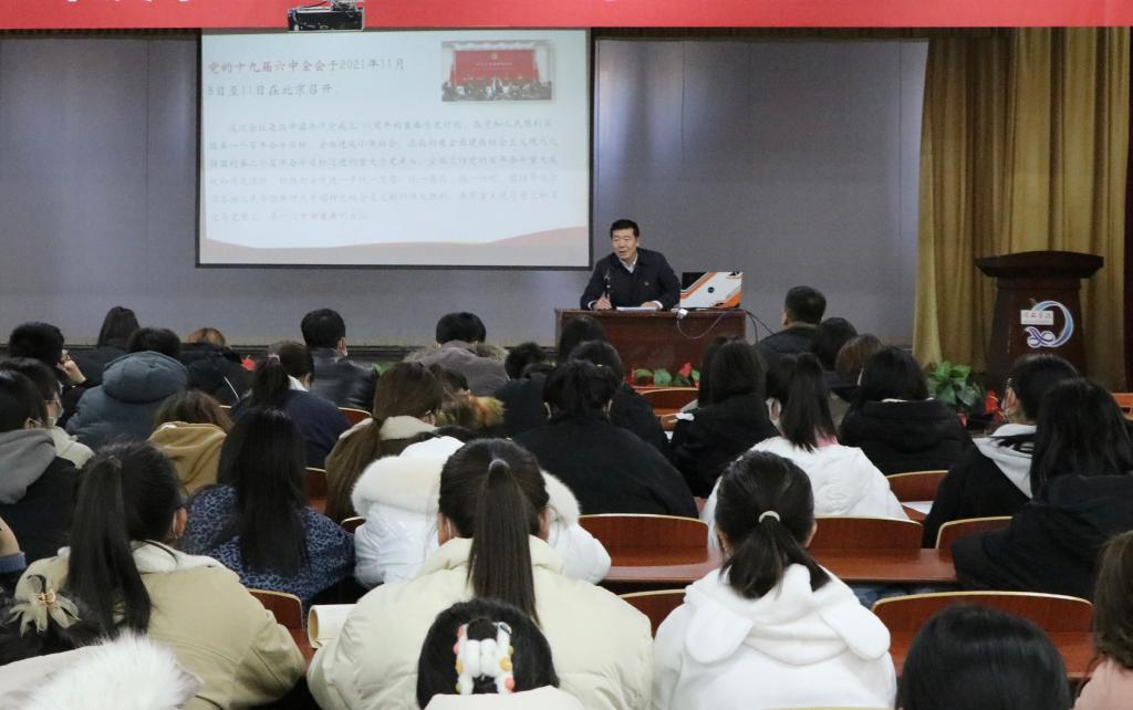 12月19日下午,护理公司党委书记沈承明在员工发展中心多功能厅作了党的十九届六中全会精神宣讲报告。公司部分教师、全体辅导员、团学组织骨干、各班员工代表等共计200余人聆听了报告会。