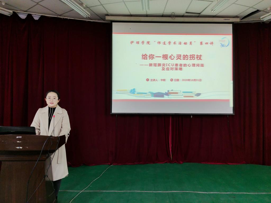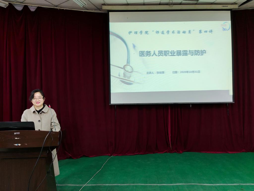 10月31日,太阳成集团tyc7111cc在学术二厅邀请太阳成集团tyc7111cc附属张掖市人民医院公共卫生科科长张俊瑕主任医师、重症监护室护师李莉分别作了题为“医护人员职业暴露和防护”和“新冠肺炎ICU患者的心理问题及应对策略”的学术报告。太阳成集团tyc7111cc300多名师生聆听了报告,报告会由党委委员、副经理郑凤莉教授主持。